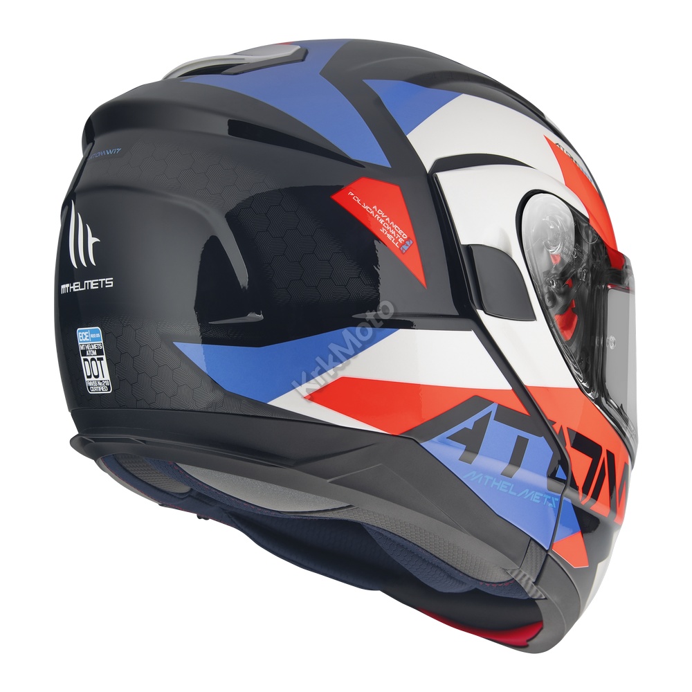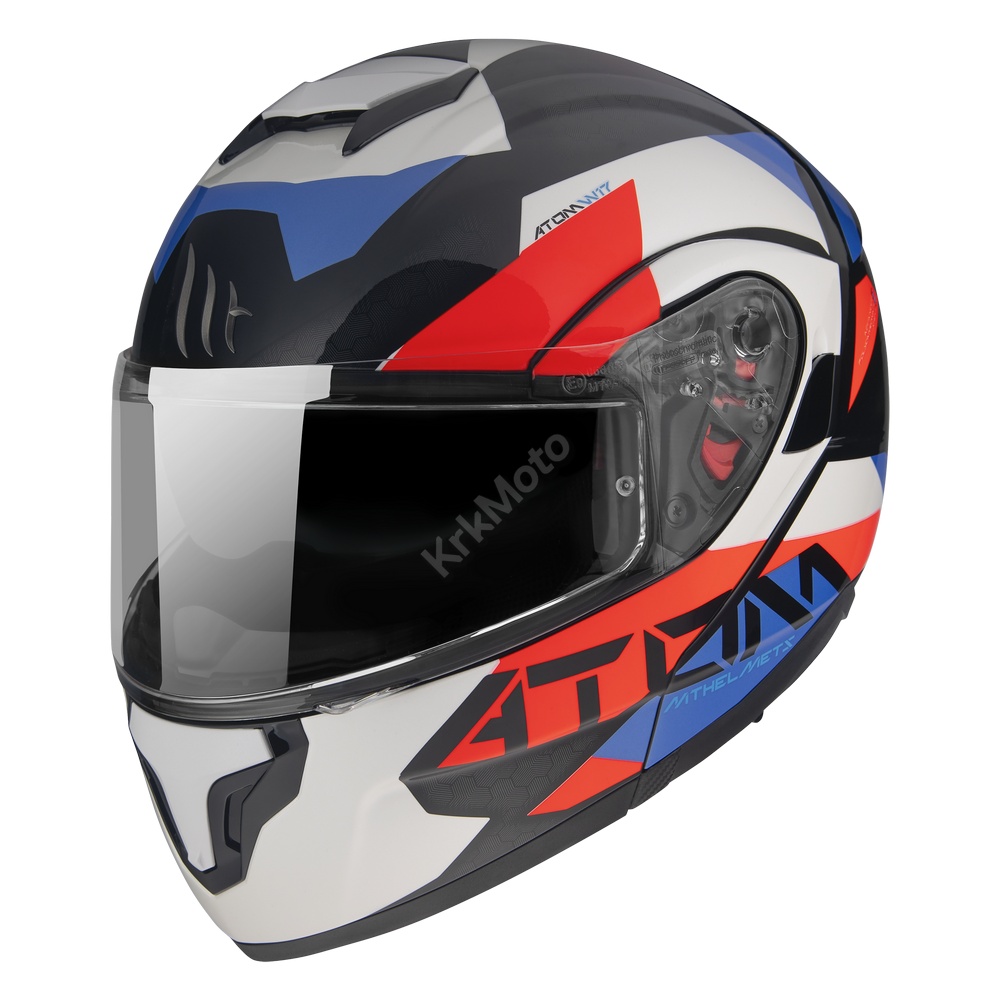 Atom SV je flip up kaciga sa vanjskim prozirnim i unutarnjim sunčanim vizirom, izrađena je od visoko otporne termo plastike sa metalnom kopčom za brzo zatvaranje.