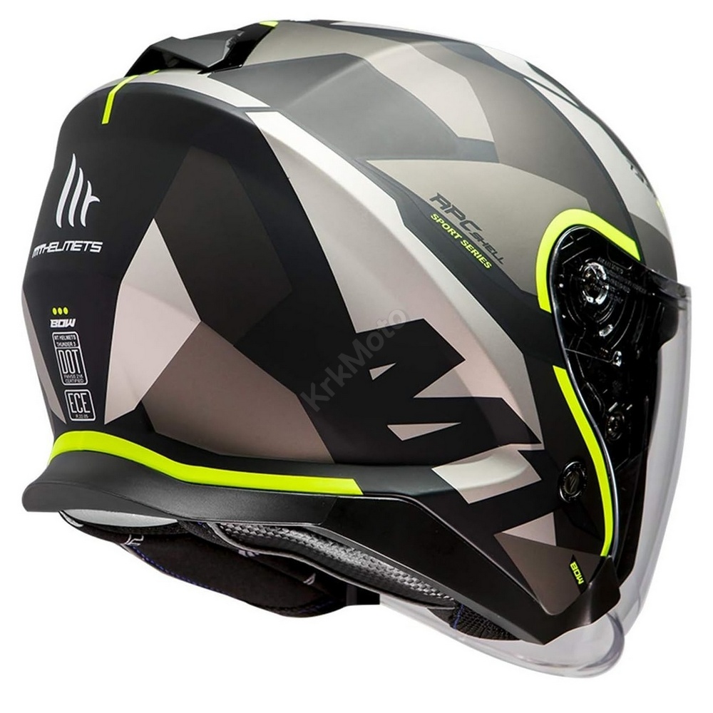 Thunder 3 SV Jet kaciga izrađena je od visokootporne termoplastike. Sadrži vanjski prozirni i unutarnji sunčani vizir. Za zakopčavanje se koristi brza metalna kopča.